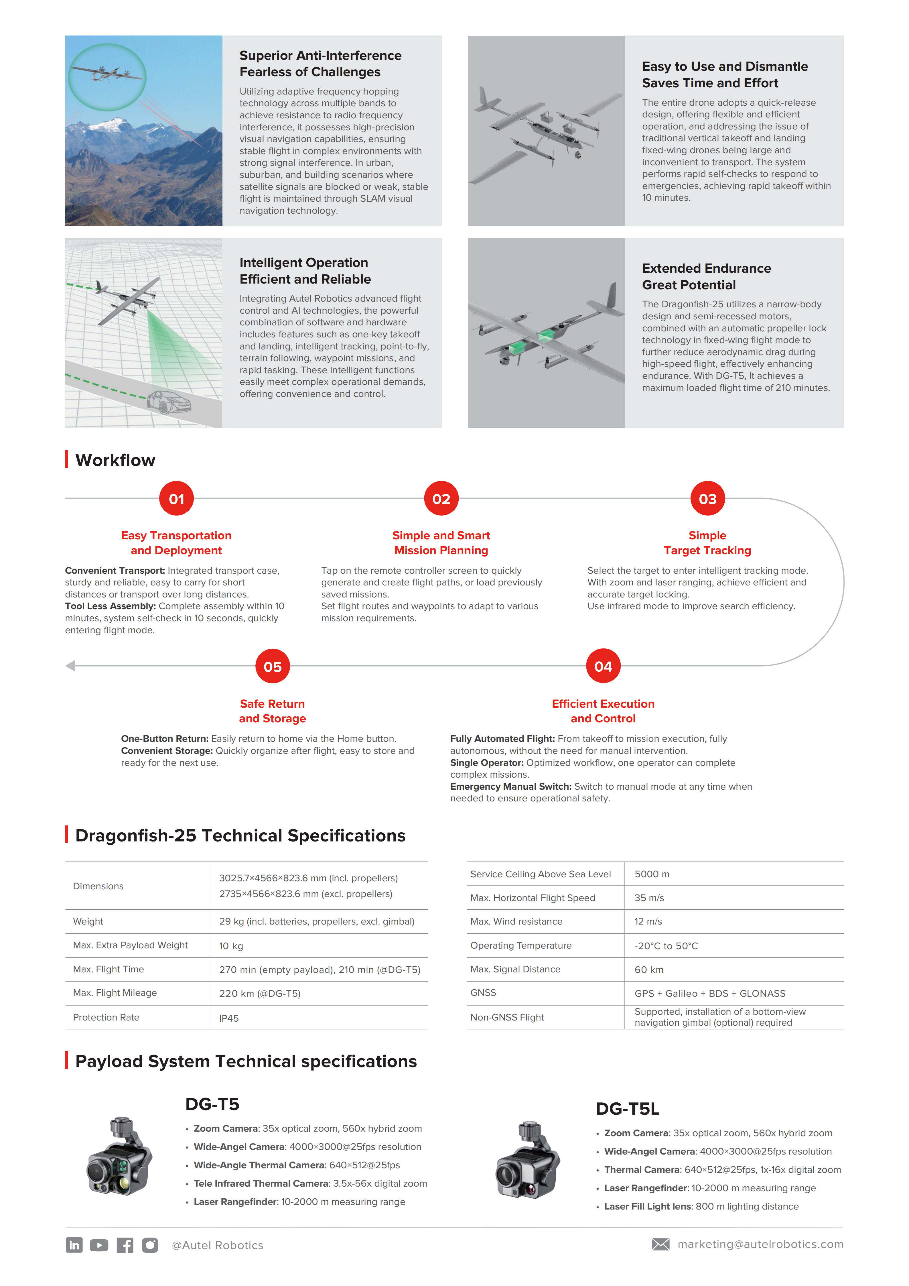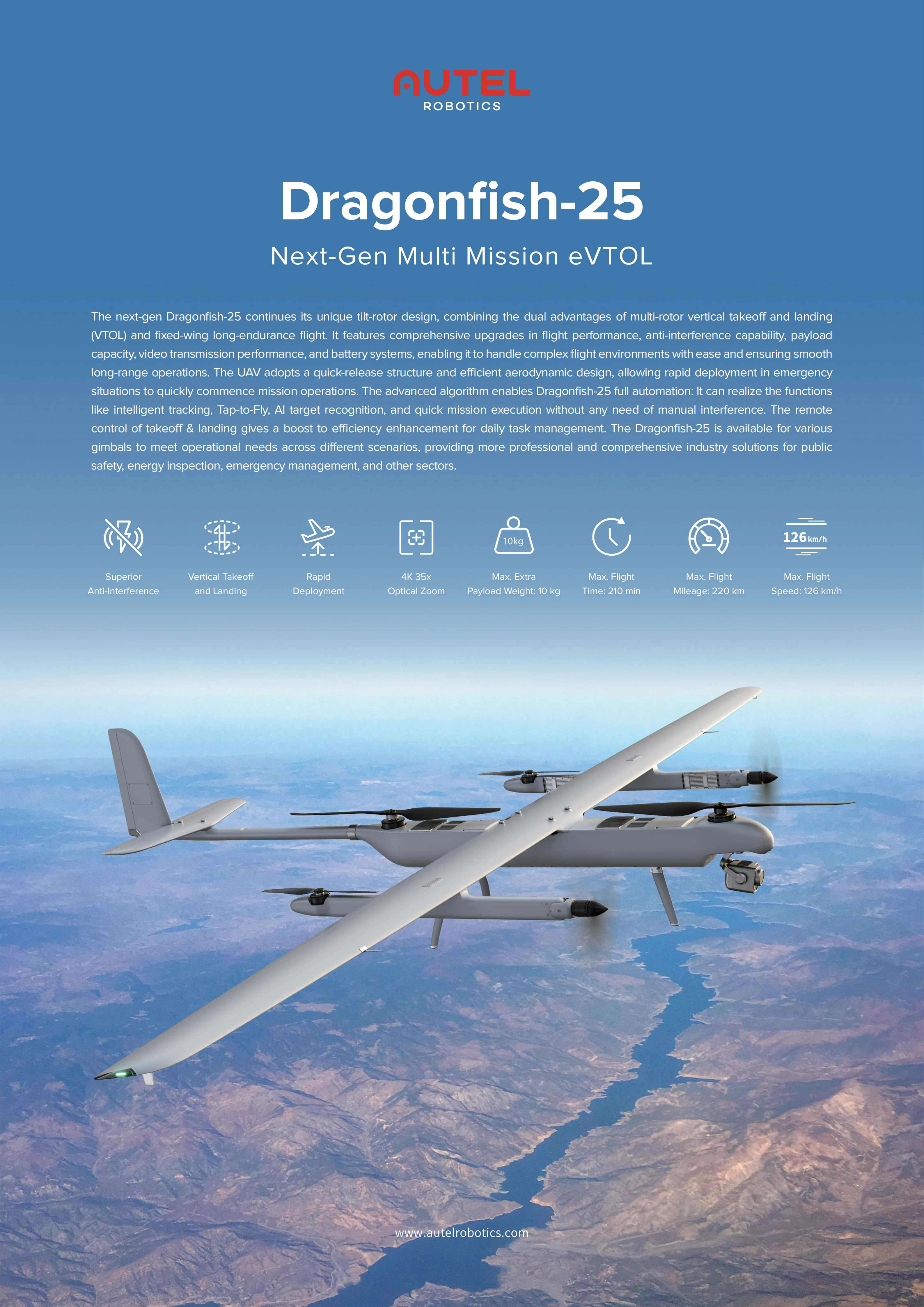 The next-gen Dragonfish-25 continues its unique tilt-rotor design, combining the dual advantages of multi-rotor vertical takeoff and landing (VTOL) and fixed-wing long-endurance flight. It features comprehensive upgrades in flight performance, anti-interf